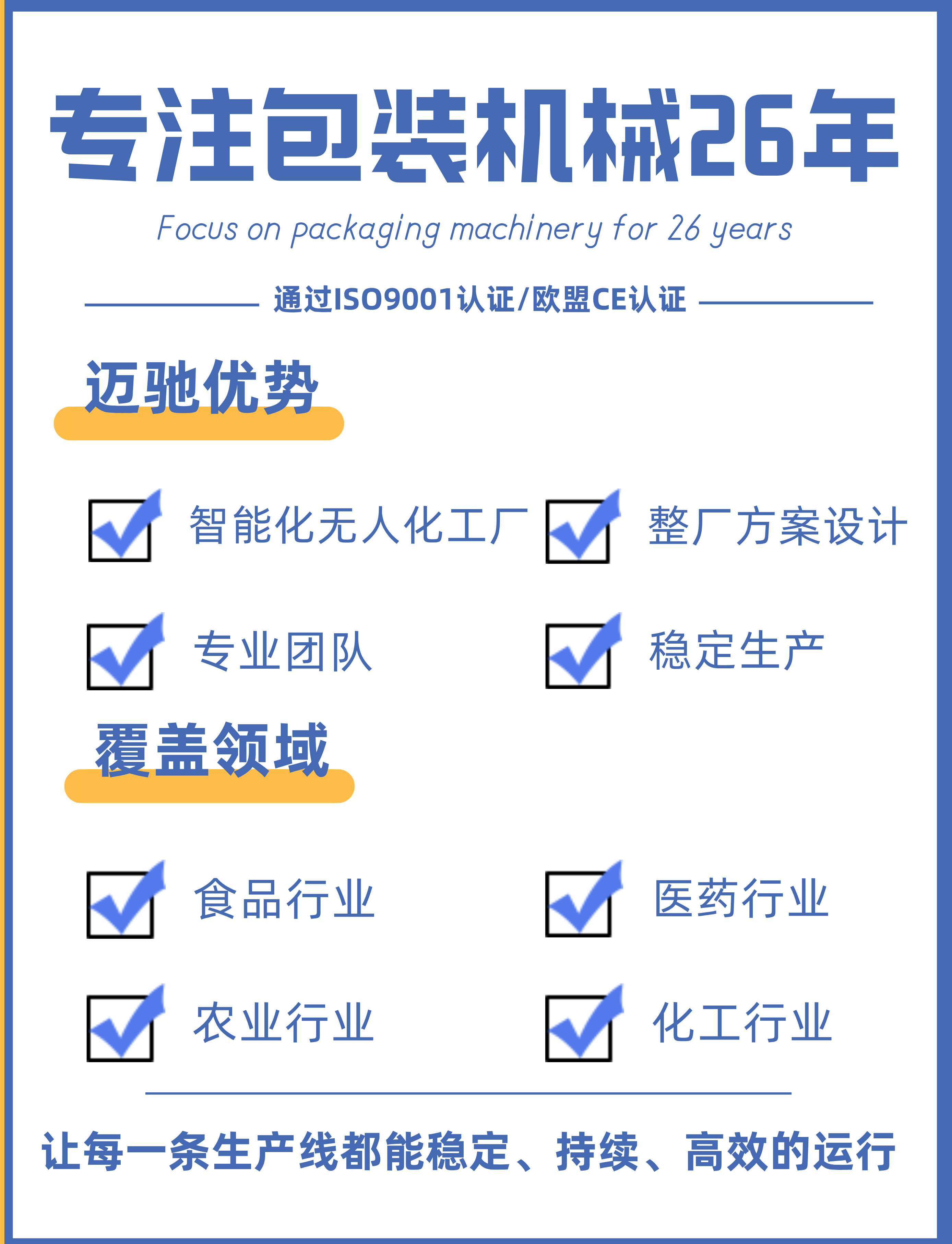 迈驰是一家专业生产全自动多列粉剂、粉末包装机整线厂家,可根据客户不同物料特性定制一对一方案,可根据产量定制列数-有序理料装盒-自动装箱-机器人码垛。整厂方案设计...